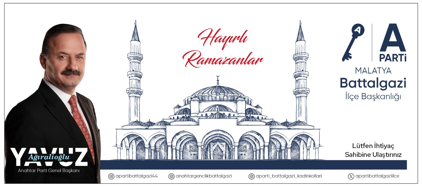 Ramazan ayı boyunca birlik, beraberlik ve dayanışma ruhunu en güçlü şekilde yaşatmayı hedefleyen Battalgazi İlçe Başkanlığı, iftar sonrası ilçe sınırları içerisindeki tüm haneleri tek tek ziyaret edecek. Ziyaretlerde, Yavuz Ağıralioğlu’nun selamları iletilerek gönüllere dokunulması hedefleniyor.