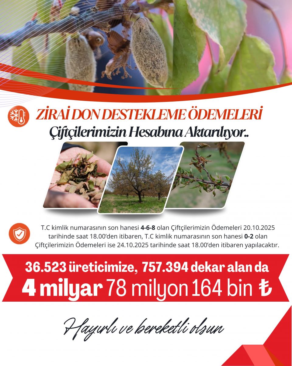 Babacan, “T.C. kimlik numarasının son hanesi 4-6-8 olan çiftçilerimizin ödemeleri 20 Ekim 2025 tarihinde saat 18.00’den itibaren, 0-2 olan çiftçilerimizin ödemeleri ise 24 Ekim 2025 tarihinde saat 18.00’den itibaren yapılacaktır. Bu kapsamda TARSİM sigartası olmayan, ancak ÇKS bulunan 36 bin 523 üreticiye, 757 bin 394 dekar alan için toplam 4 milyar 78 milyon 164 bin TL destek sağlanacak." şeklindeki bilgiyi paylaştı.