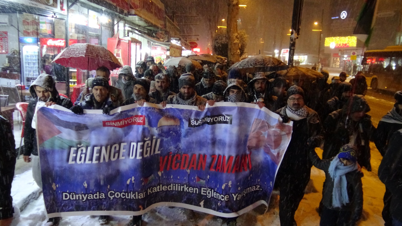 Malatya’da Kudüs Kardeşlik Platformu öncülüğünde düzenlenen yürüyüş ve basın açıklamasında, Gazze’de yaşanan katliamlara dikkat çekilerek yılbaşı kutlamalarına tepki gösterildi. “Eğlence değil, vicdan zamanı; dünyada çocuklar katledilirken eğlence yakışmaz” sloganıyla gerçekleştirilen etkinliğe çok sayıda vatandaş katıldı.