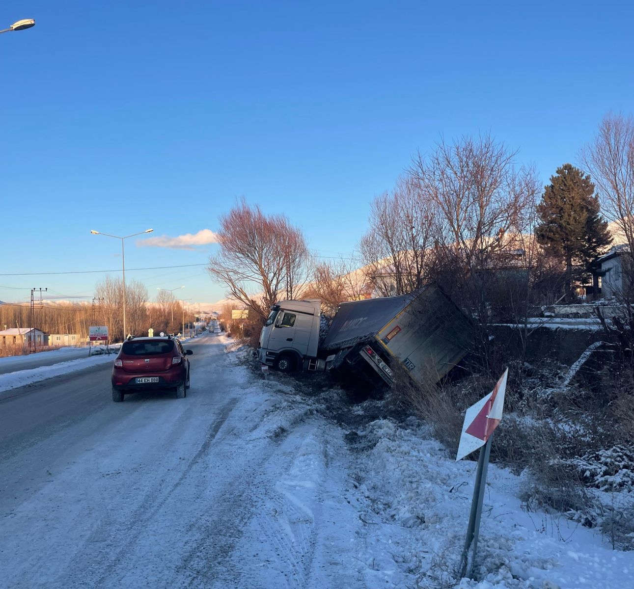 Edinilen bilgilere göre, seyir halindeki tır sürücüsünün buzlanma nedeniyle direksiyon hâkimiyetini kaybetmesi sonucu araç yoldan çıkarak yan yattı.