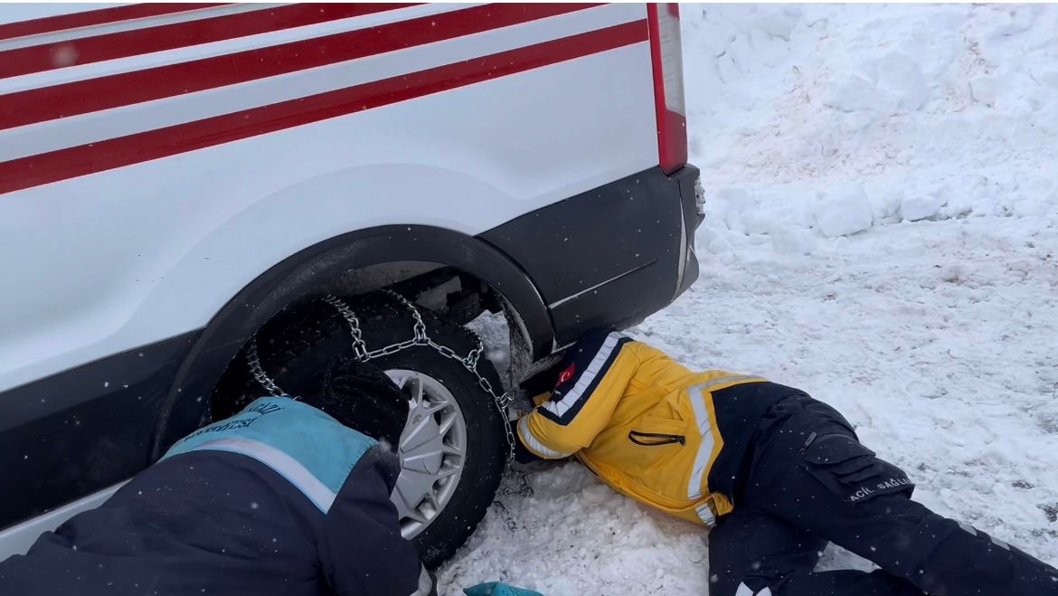 Belediye ekipleri, iş makineleriyle yolları açarken, ambulansın ilerleyebilmesi için araca zincir takılmasına da destek sağladı. Ancak tüm müdahalelere rağmen ambulansın çıkamaması üzerine sağlık ekipleri iş makinesine bindirilerek hastanın bulunduğu eve ulaştırıldı.