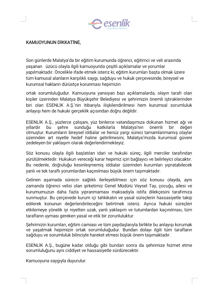 Açıklamanın sonunda; eğitim camiası, kurumlar ve tüm paydaşların sorumluluk bilinciyle hareket etmesinin önemi vurgulandı. ESENLİK A.Ş., Malatya’ya hizmet etme sorumluluğunu aynı ciddiyet ve hassasiyetle sürdüreceğini kamuoyuna saygıyla duyurdu.