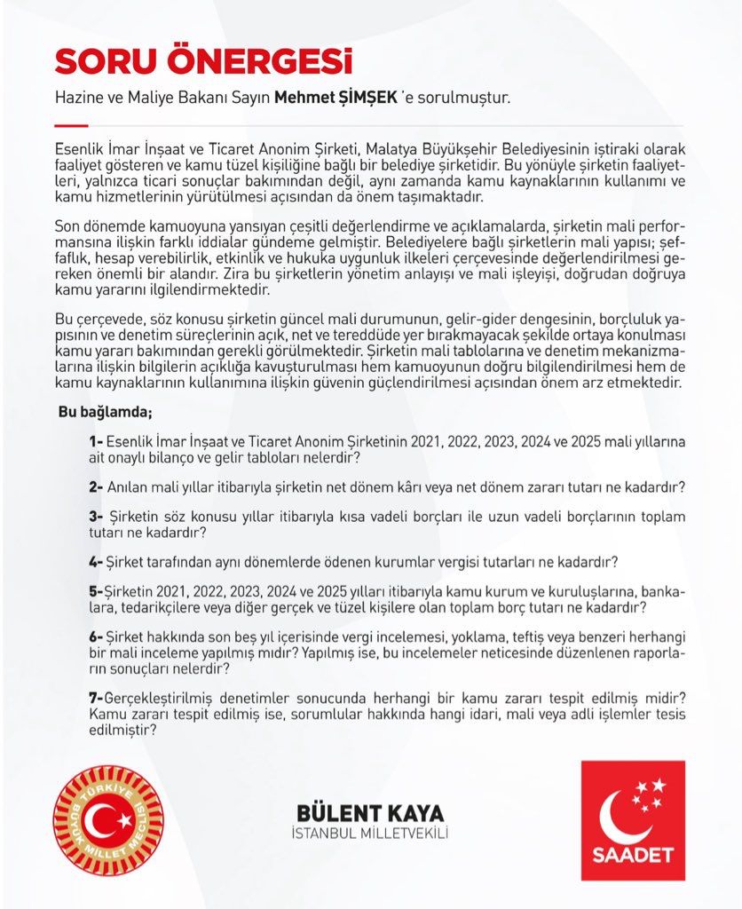 Saadet Partisi, Türkiye Büyük Millet Meclisi’nde İstanbul Milletvekili Bülent Kaya aracılığıyla Esenlik Marketleri hakkında soru önergesi verdiğini duyurdu.