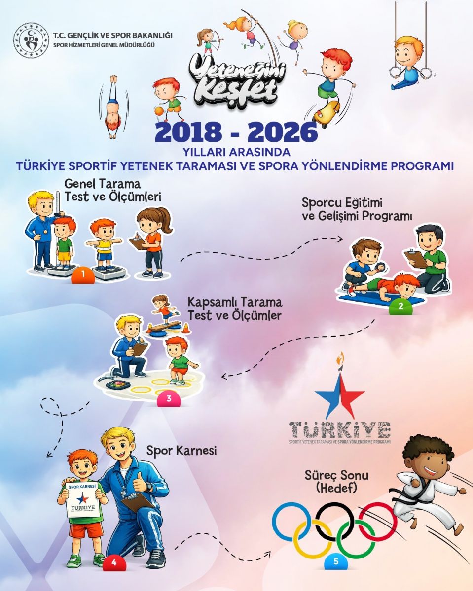 2018 yılından bu yana Gençlik ve Spor Bakanlığımızın koordinesinde İlimizde yürütülmekte olan Türkiye Sportif Yetenek Taraması ve Spora Yönlendirme Programında, 2025-2026 Eğitim-Öğretim yılı itibariyle test/ölçümler, eğitimler ve sporcu yönlendirmeleri gibi bilimsel temele dayalı süreçler kararlılıkla devam ettirilmekte olup spor altyapımıza ve ülke sporumuzun geleceğine katkı sağlamaya devam etmekteyiz.
