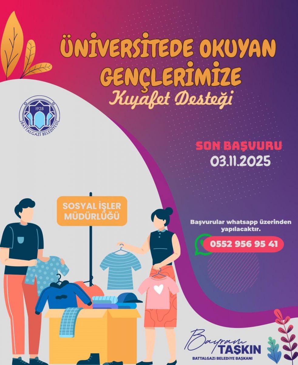 Battalgazi Belediyesi Sosyal Yardım İşleri Müdürlüğü koordinasyonunda yürütülen destek programlarıyla ihtiyaç sahibi ailelere halı, mobilya ve beyaz eşya desteği sağlanırken, “Giyilebilir Mutluluk” kampanyası kapsamında her yaş grubuna uygun kıyafetler dağıtıldı. Üniversitede okuyan gençlere yönelik kıyafet desteği programı da bu yıl yoğun başvuru aldı. Teslim edilen giysiler, özellikle şehir dışında eğitim gören gençler ve dar gelirli aileler için önemli bir destek oldu.